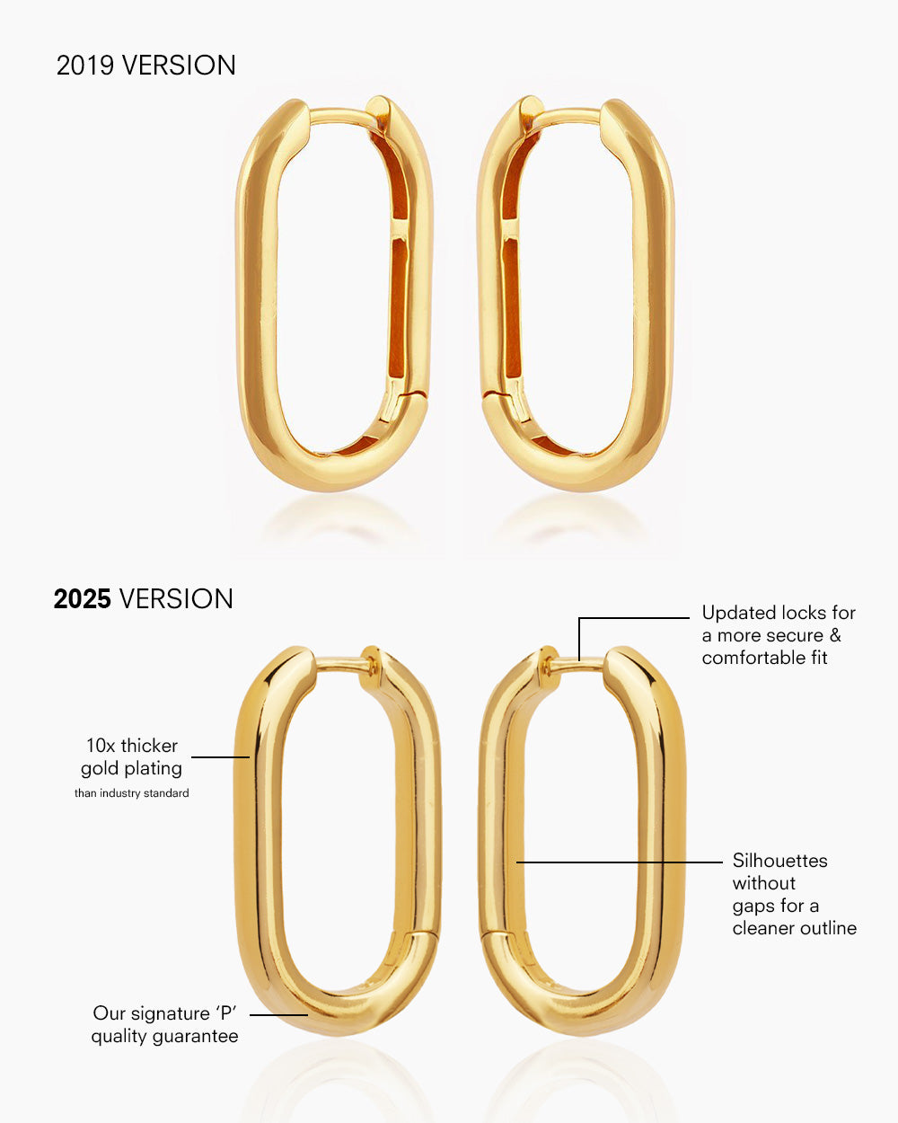 Meet your new go-to for everyday elegance. The Venus Gold Hoops are a modern take on a timeless classic, featuring a flattering oval silhouette. Finished with improved 14k gold plating, it's a tried and tested favorite loved for its versatility.