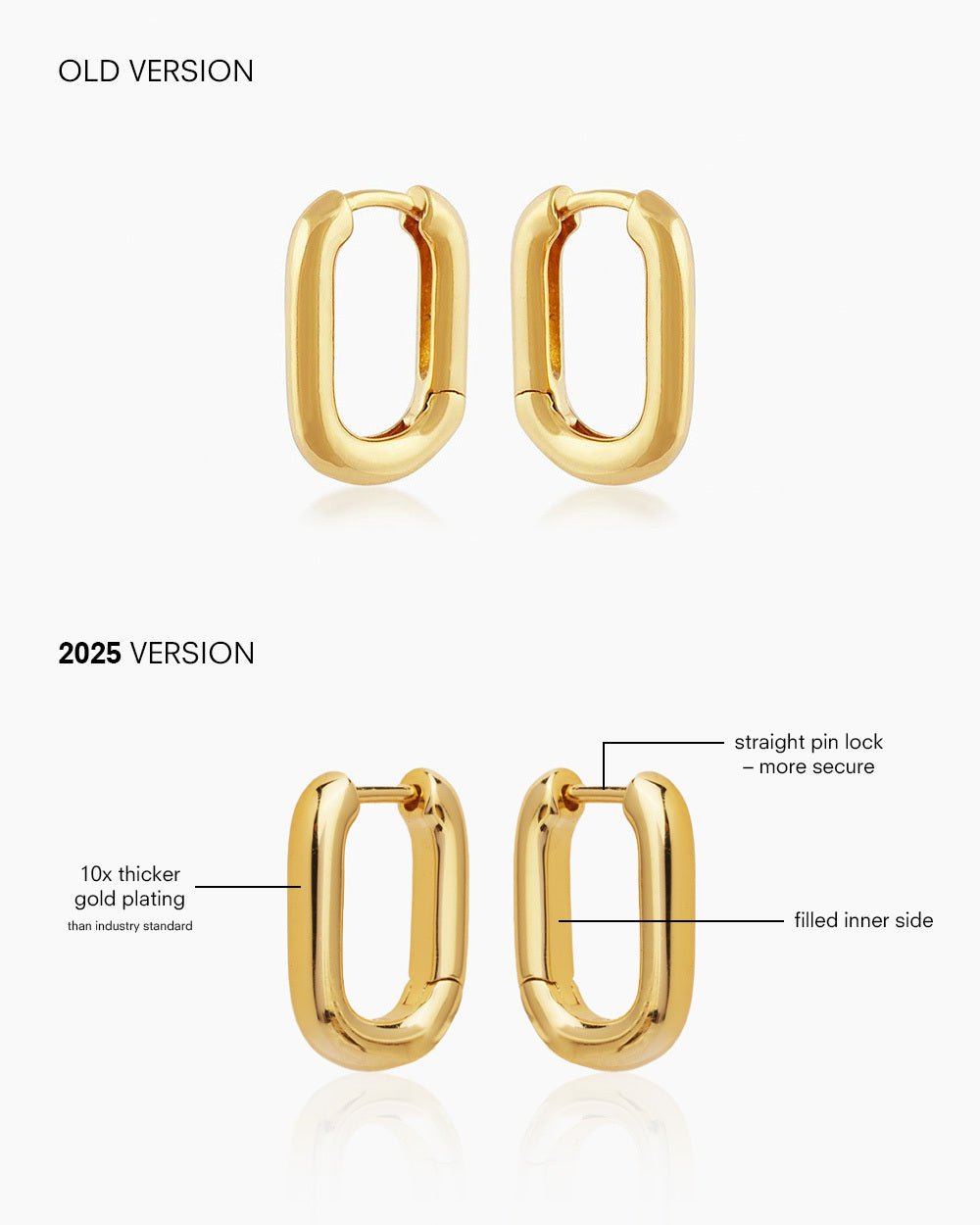 An elevated take on a classic favorite. These oval-shaped huggies have a modern, structured finish, and are now crafted with a filled interior and open-lock clasp for better wear. Upgraded with rich 14k gold plating, they��re perfect for stacking or wearing solo.